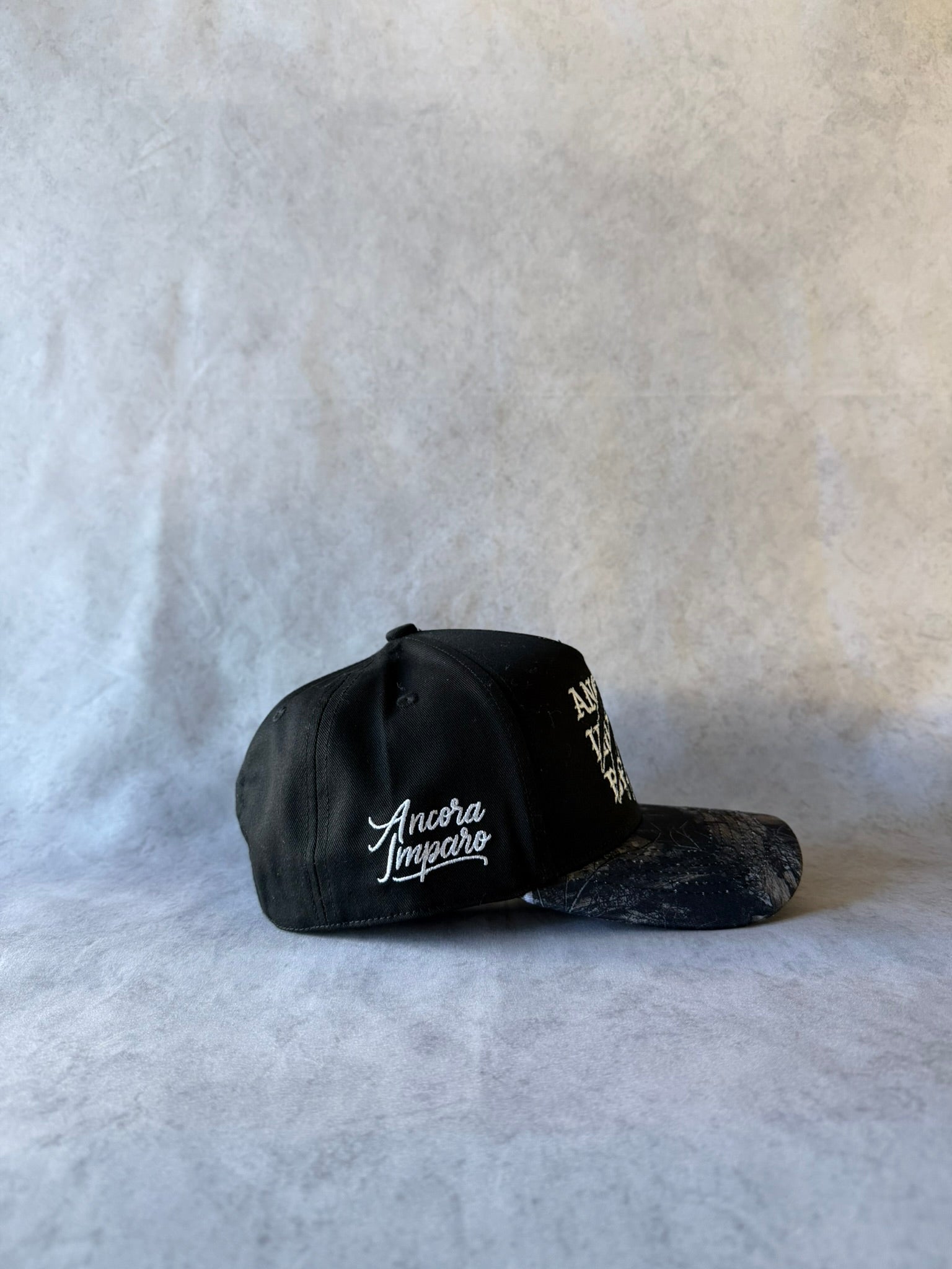 The Tiger Hunt Camo Hat blends tactical camo textures with bold Ancora Imparo embroidery across the crown, symbolizing discipline sharpened through struggle. Finished with dual side embroidery details, this piece balances raw energy with refined construction.